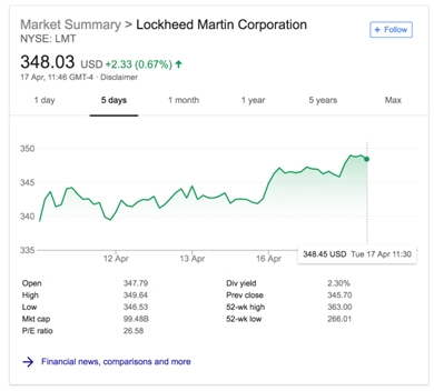 Es obvio que los fabricantes de armas como Lockheed Martin se beneficiarán financieramente de las ventas y el posterior uso de sus armas en la guerra, y el aumento dramático en el precio de las acciones de los contratistas de defensa desde que comenzó la llamada Guerra contra el Terrorismo en 2001 son un testimonio de este hecho grotesco.