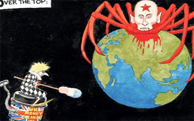 La actual campaña contra Rusia retoma formulaciones tradicionales de la propaganda nazi de la Segunda Guerra Mundial y las del antisovietismo de la guerra fría. Antes se incriminaba a «los judíos» y «los comunistas», ahora los mismos clichés –utilizados esta vez contra Rusia– parecen hacer innecesaria la presentación de argumentos y pruebas. Cuesta trabajo no ver la similitud cuando se representa a Vladimir Putin como la célebre «araña judía» y además con «la estrella roja» en la frente.