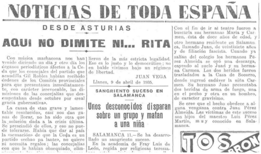 El día 11 de abril de 1935 Carmen Pérez Almeida, una niña de doce años, caía asesinada por las balas del odio disparadas por pistoleros de la Federación Anarquista Ibérica cuando, en compañía de su hermano Juan, de profesión electricista y 27 años de edad, y de su novia María, iban a recoger a su hermana Guadalupe a la Academia Fray Luis de León de Salamanca, donde Guadalupe era limpiadora, para llevar a la pequeña Carmen a una función de teatro infantil. Eran hijos de Luis Pérez Martín, un anciano maestro de la localidad castellana muy conocido por su amplia labor pedagógica.