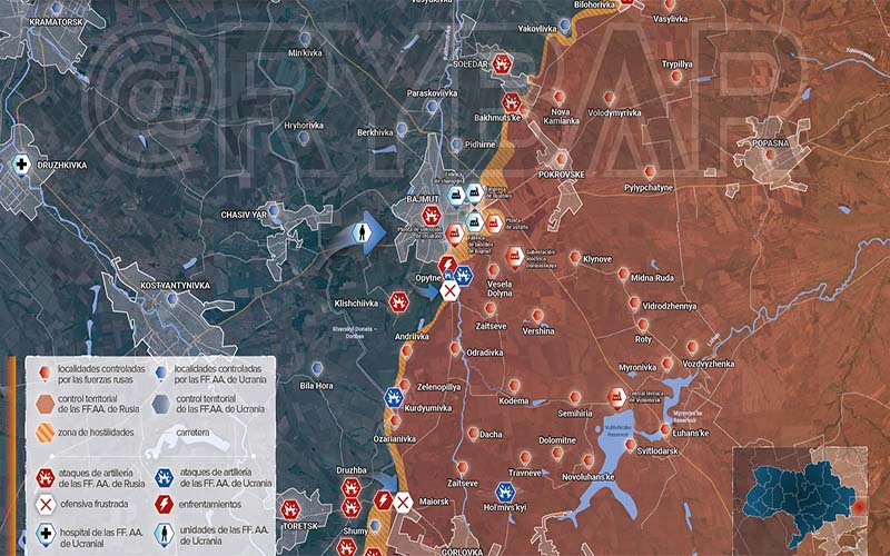La lucha continúa por los experimentados, ya en el pueblo, en el centro de Maryinka y en las afueras del este de Bakhmut. En el área de Kurdyumovka, el ejército ruso continúa repeliendo todos los intentos de las Fuerzas Armadas de Ucrania de restaurar las posiciones perdidas. Se informa sobre el traslado apresurado de refuerzos de las Fuerzas Armadas de Ucrania y extranjeros a estas áreas.