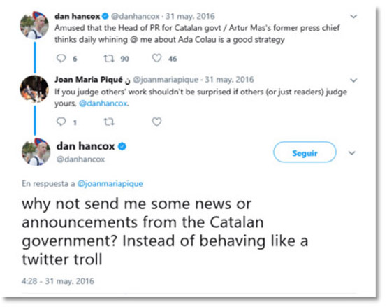 Varios profesionales denuncian haber sido "apercibidos", "corregidos" o adoctrinados por Piqué sobre el enfoque de las informaciones, y así lo han denunciado ante las organizaciones, sus empresas e incluso los consulados de sus países. El corresponsal de 'The Guardian' le llegó a pedir que "deje de hacer el trol" y "le envíe la información".