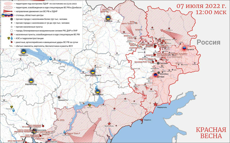 • En el contexto de los fracasos militares y la retirada masiva de las tropas ucranianas en el Donbass, en la noche del 7 de julio, el régimen de Kyiv intentó entregar simbólicamente la bandera a la isla SNAKE. Aproximadamente a las 5 am, varios militares ucranianos aterrizaron en la isla desde un bote a motor y se tomaron fotografías con la bandera. Un avión de las Fuerzas Aeroespaciales Rusas lanzó inmediatamente un ataque con misiles de alta precisión en la isla ZMEINYIY, como resultado de lo cual parte del personal militar ucraniano fue destruido. Los sobrevivientes huyeron en dirección al pueblo de PRIMORSKOE en la región de Odessa.