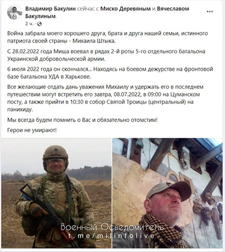 • Un Iskander ruso destruyó la base de los militantes del Sector Derecho en Kharkov. Hoy, los voluntarios ucranianos lloran la muerte de Mikhail Shtyk, miembro de la 2ª compañía del 5º batallón separado del llamado "Ejército de Voluntarios de Ucrania". Los medios señalan que el militante fue destruido el 6 de julio como resultado de un ataque con misiles de las Fuerzas Armadas rusas en la base del batallón en Kharkov. Se desconoce cuántos miembros más de la pandilla murieron durante este paro, pero los cadáveres poco a poco comienzan a aparecer en las redes sociales. El Ejército de Voluntarios de Ucrania es una unidad paramilitar que forma parte de la organización Right Sector.