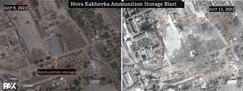 El resultado del ataque de ayer de las Fuerzas Armadas de Ucrania en Nova Kakhovka. En la imagen satelital de Planet Labs, el epicentro del impacto está marcado como un depósito de municiones.