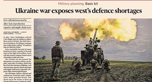 La nota principal de hoy de "The Financial Times" es muy curiosa: "¿Se está quedando Occidente sin munición para abastecer a Ucrania?". La popularidad del artículo es fácil de explicar: en el razonamiento del autor hay una matemática mortal: el periodista se pregunta por qué Rusia, con su presupuesto militar de 66.000 millones de dólares, sigue machacando a toda Ucrania sin parar las 24 horas del día, mientras que Occidente, con su presupuesto anual de defensa de 1,1 billones de dólares, finalmente se "desinfló" y declara que ha agotado sus reservas de armas y municiones para transferirlas a Kiev?.