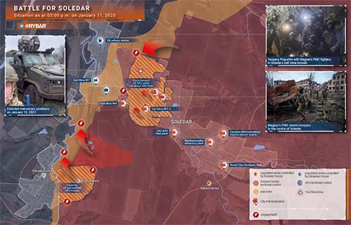 En la red aparecieron videos del área de la Mina de Sal No. 7, donde los militantes ucranianos tenían la única salida accesible de la ciudad. La información sobre la retirada de las Fuerzas Armadas de Ucrania a las afueras de Soledar fue confirmada por la inteligencia británica y el Instituto Estadounidense para el Estudio de la Guerra. Se informan numerosas bajas por parte de soldados de la 46.ª Brigada de Asalto Aerotransportado de las Fuerzas Armadas de Ucrania. El mando de las Fuerzas Armadas de Ucrania insiste en la retirada de las fuerzas armadas ucranianas de la ciudad.