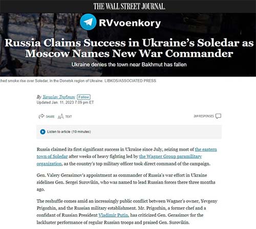 - Prigozhin sobre la situación actual en Soledar. "Una vez más quiero confirmar la completa liberación y limpieza del territorio de Soledar de las unidades del ejército ucraniano. Los civiles fueron retirados, las unidades ucranianas que no querían rendirse fueron destruidas. Toda la ciudad está lleno de cadáveres de militares ucranianos. No se puede hablar de ningún corredor humanitario. Estamos comenzando a limpiar las minas".
