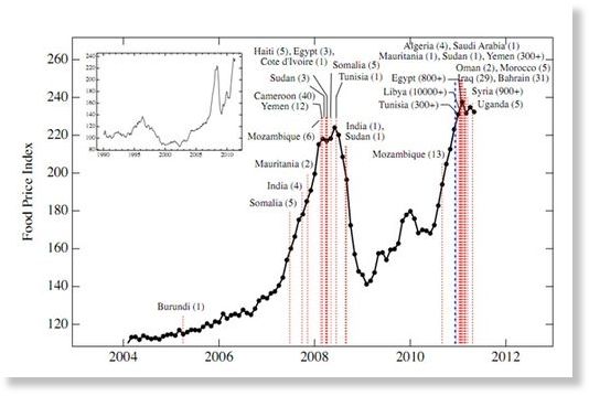 En 2011, el Instituto de Sistemas Complejos de Nueva Inglaterra (NECSI por sus siglas en inglés), un cuerpo de académicos de Harvard y MIT, utilizando datos del Índice de Precios de Alimentos de la Organización de la Comida y la Agricultura de la ONU (FAO), publicó un documento que señalaba una relación entre los "sucesos de agitación" en 2008 y 2011 con los incrementos de los precios de la comida. Aseguran haber identificado el umbral preciso para que los precios globales de la comida lleven a agitación mundial: 210 puntos...