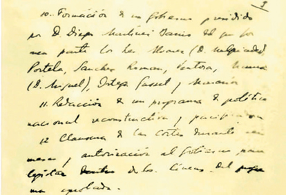 Manuscrito en el que José Antonio proponía un Gobierno de todas las tendencias presidido por el republicano Martínez Barrio, y en el que figuraban nombres tan variopintos como los de Miguel Maura, Indalecio Prieto, Gregorio Marañón y Ortega y Gasset