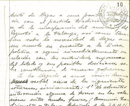 Acta de la Falange, en la que se rechaza tener relaciones con otras fuerzas